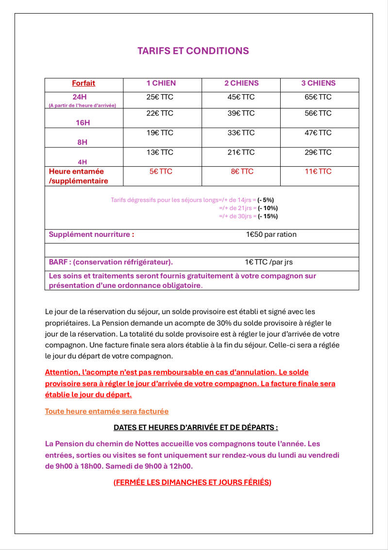 Afin de continuer à vous offrir un service de qualité et de garantir le bien-être de vos compagnons, les tarifs de la Pension du Chemin de Nottes seront révisés à compter du 1er janvier 2026.